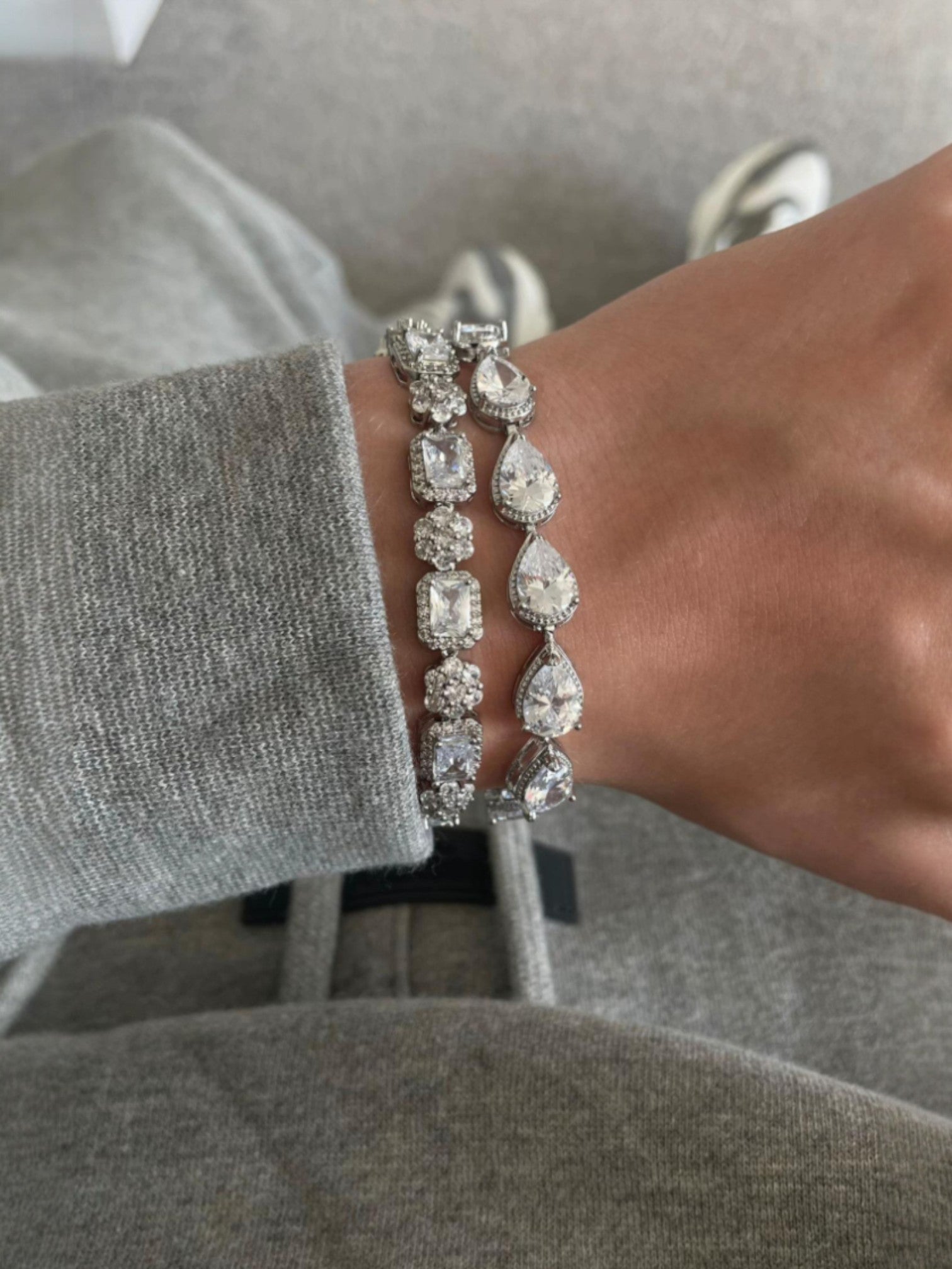 Teardrops of ice, framed in stars. The Star Crystal Bracelet alternates pear-cut zircon halos with four-pointed star links — refined, layered, and built to catch light from every angle.